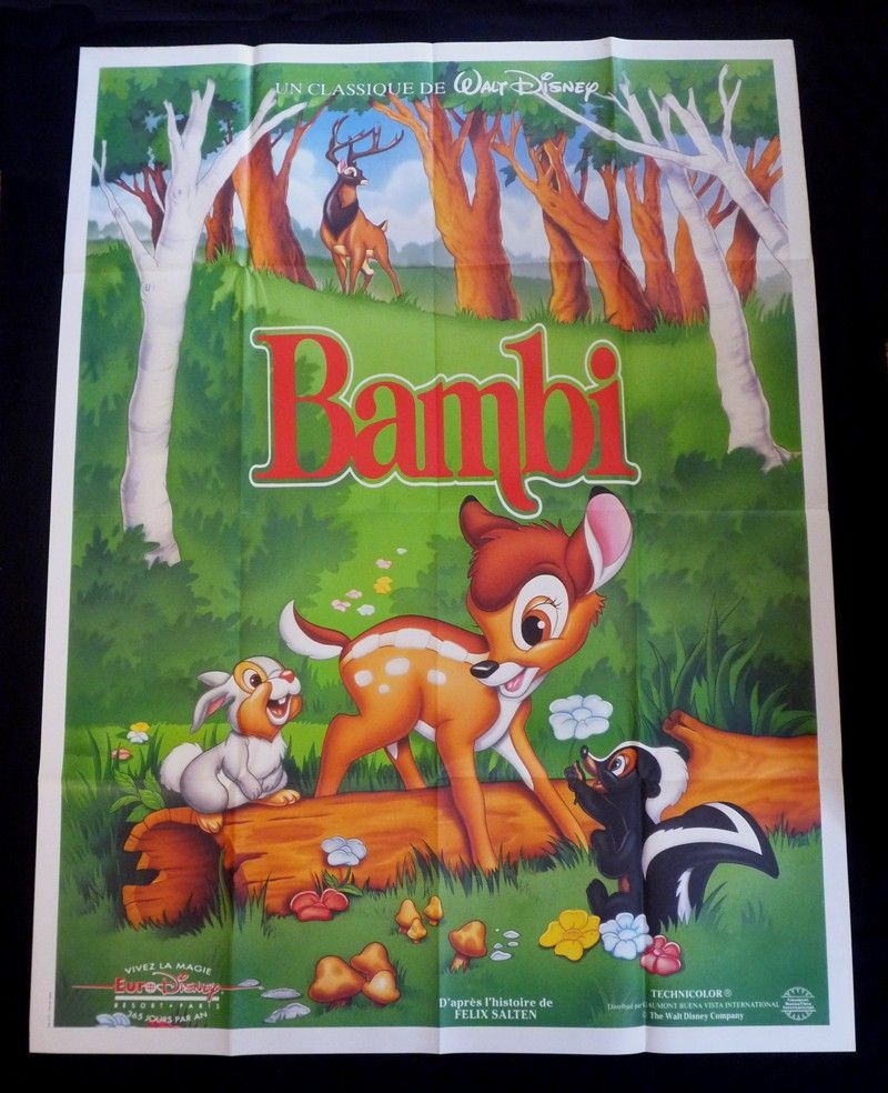 Affiche (env. 117 x 157 cm) du film Bambi (1942) réalisé par David D. Hand ; bords très légèrement frottés par endroits, pas de trous d'épingle, bel état.
