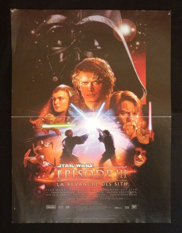 Affichette (40 x 54,3 cm) du film Star Wars Episode III : La revanche des Sith (2005, réalisé par George Lucas), préalablement pliée en deux ; trous d'épingle dans les coins supérieurs, par ailleurs bon état général.