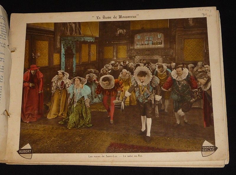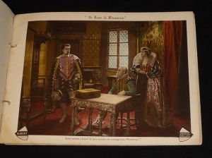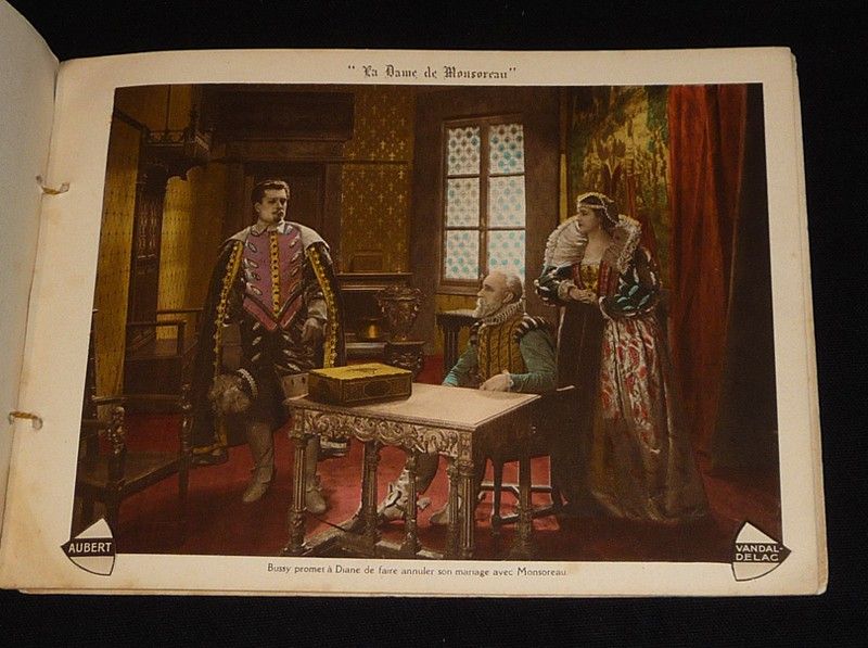 In-8 (24,7 x 18 cm), format à l'italienne, plaquette reliée par un cordon, sans date (circa 1923), livret de photographies du film "La Dame de Monsoreau" de René Le Somptier, imprimées en héliogravure et rehaussées en couleurs. La plaquette est placée sous chemise cartonnée reliée par un amateur ; coins cornés, rousseurs aux plats, par ailleurs assez bon état.
