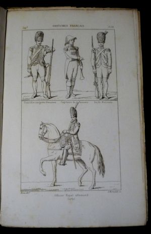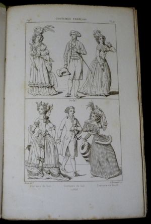 In-8 (15,3 x 24 cm), sans date, 15 planches en noir et blanc éparses de "Costumes français", portant les numéros suivants : 4bis, 30, 32, 31, 36, 39, 40, 41, 42, 43, 37, 38, 51, 52, 53 ; quelques légères rousseurs, bon état général.