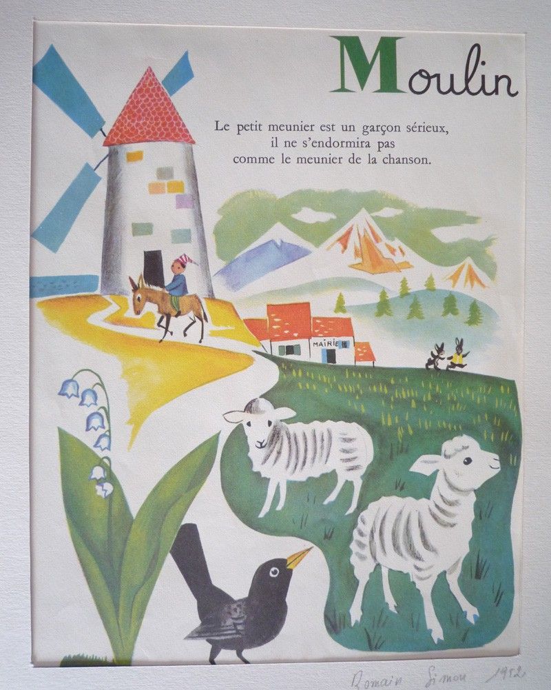 Illustration en couleurs (20,5 x 27 cm sur support 23 x 31 cm) par Romain Simon, tiré de "Mon grand alphabet" (1952) ; très bon état.