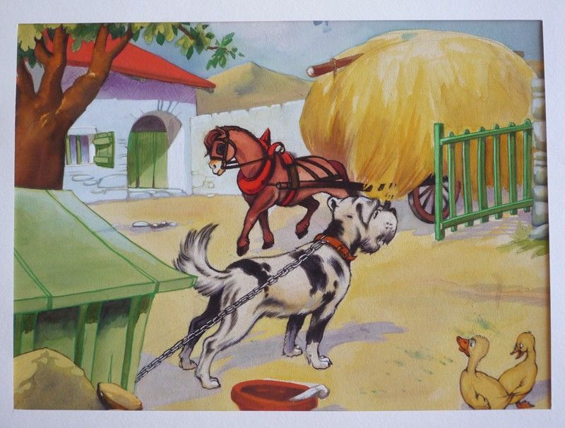 Dessin original en couleurs (28,5 x 20,5 cm) de Dupuich pour l'album "A la ferme" (circa 1950) édité par Artima ; magnifiques couleurs, dessin en superbe état....