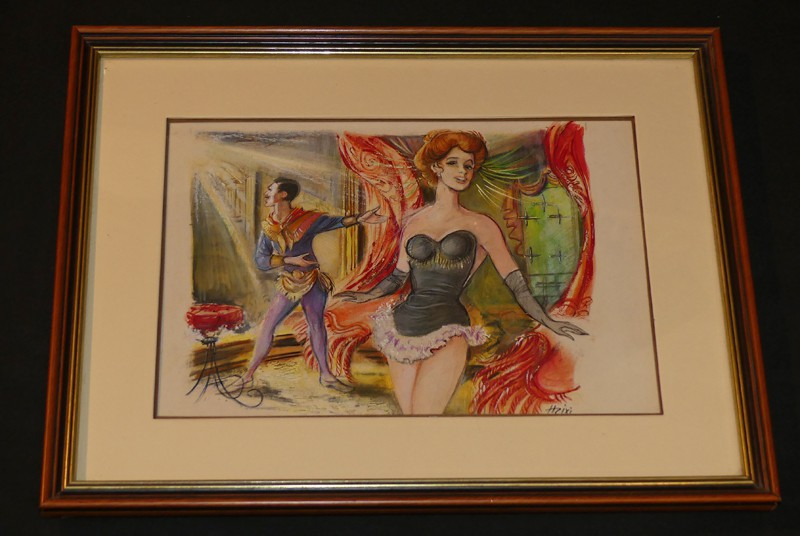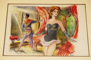 Dessin original au pastel de Mixi-Bérel, qui signe ici "Mixi", pseudonyme du dessinateur et illustrateur Maurice Bérel (1914-1994), sans date, dimensions : illustration 28,5 x 19,7 cm, sous passe-partout crème, dans un cadre bois/noir/doré de 40,7 x 31,8 cm ; encadrement fragilisé, à renforcer, par ailleurs bel état général.