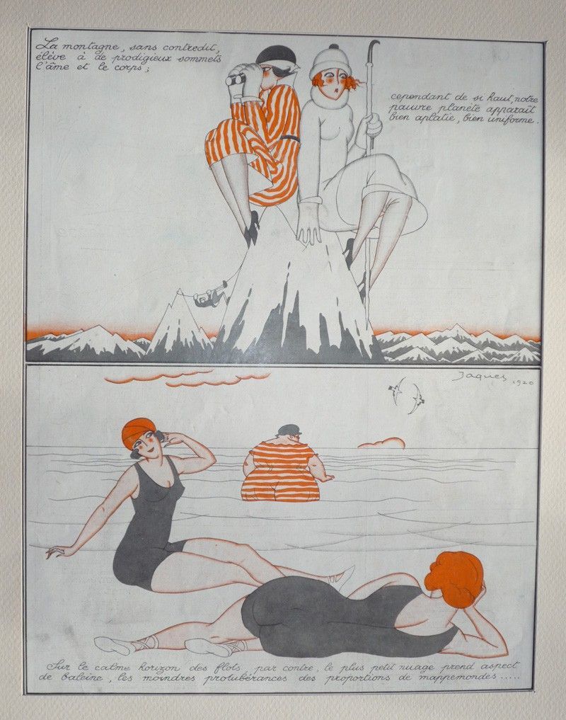 Gravure (21 x 27 cm sur support 24,5 x 32,7 cm), deux dessins en couleurs par Jaques intitulés "Le vertige des cîmes" et "la douceur des grèves" tirés de La Vie Parisienne ; bel état.