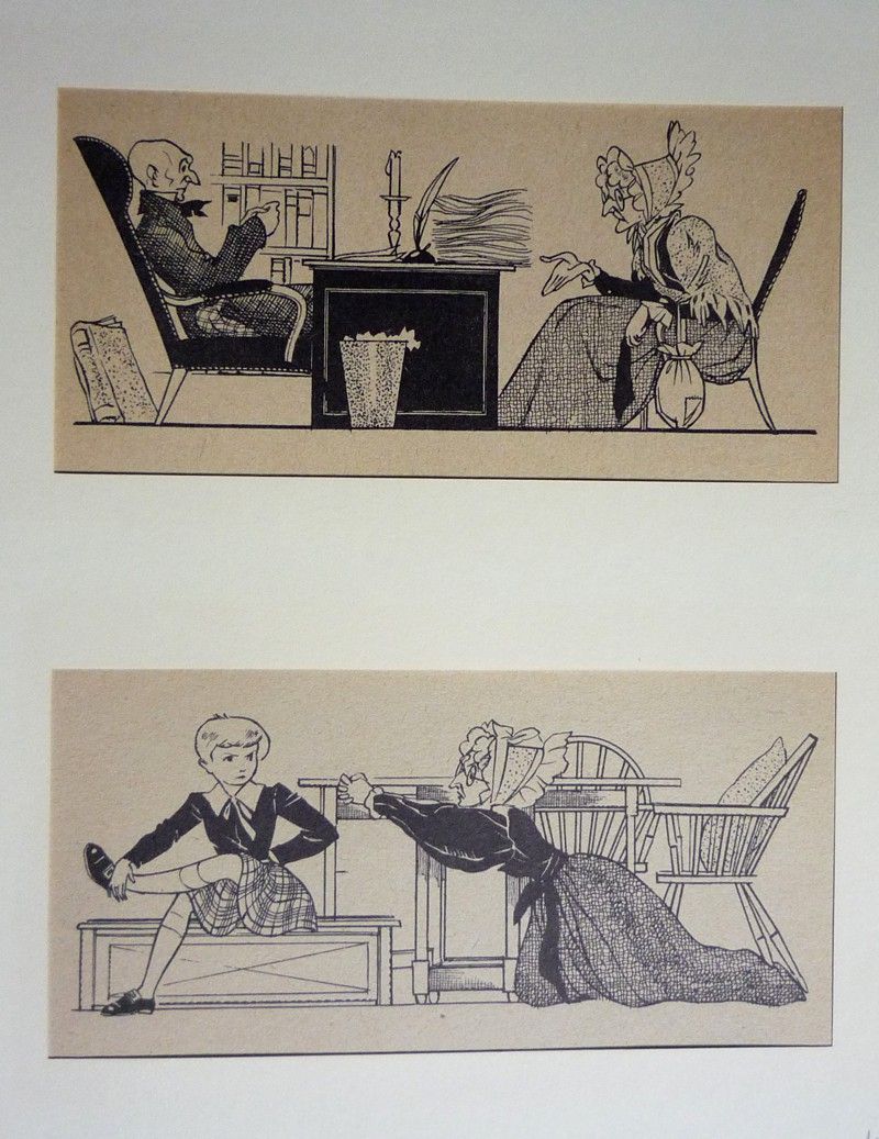 Deux illustrations en noir (environ 10 x 19 cm) par Manon Iessel, représentant des scènes du roman "Un bon petit diable" de la Comtesse de Ségur (homme et grand-mère en conversation autour d'un bureau ; grand-mère suppliant un garçon) ; papier légèrement bruni, par ailleurs bel état.