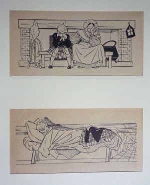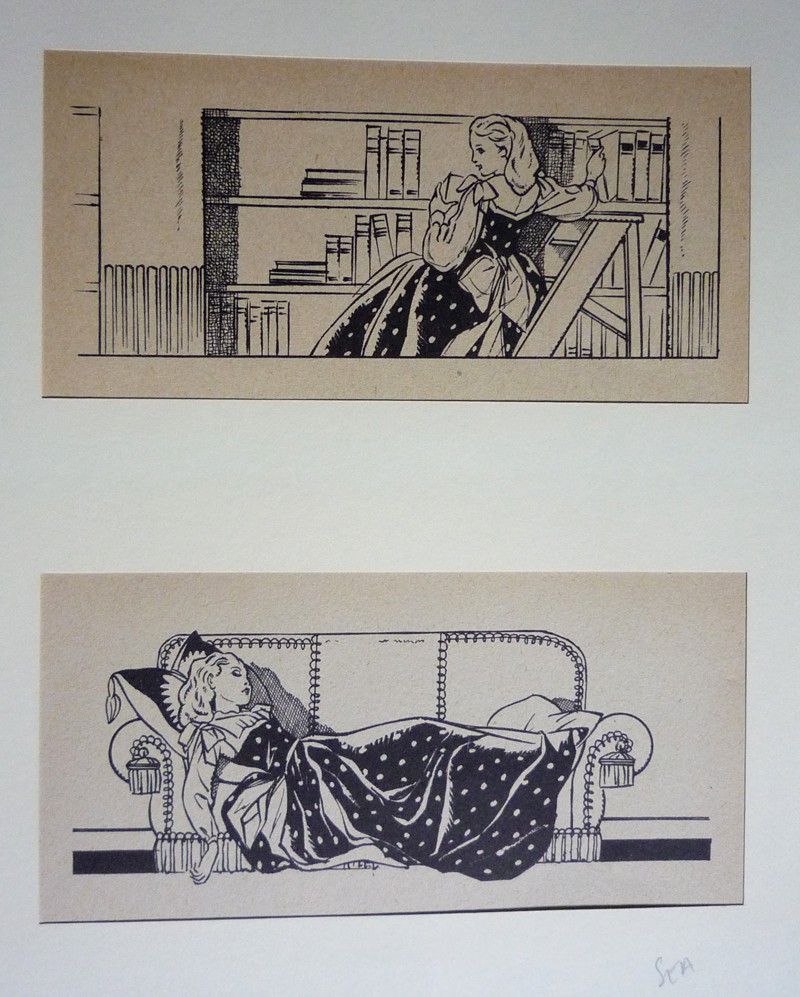 Deux illustrations en noir (environ 10 x 19 cm) par Manon Iessel, représentant des scènes du roman "Après la pluie, le beau temps" de la Comtesse de Ségur (jeune femme devant une bibliothèque ; jeune femme endormie sur un canapé) ; papier légèrement bruni, par ailleurs bel état.