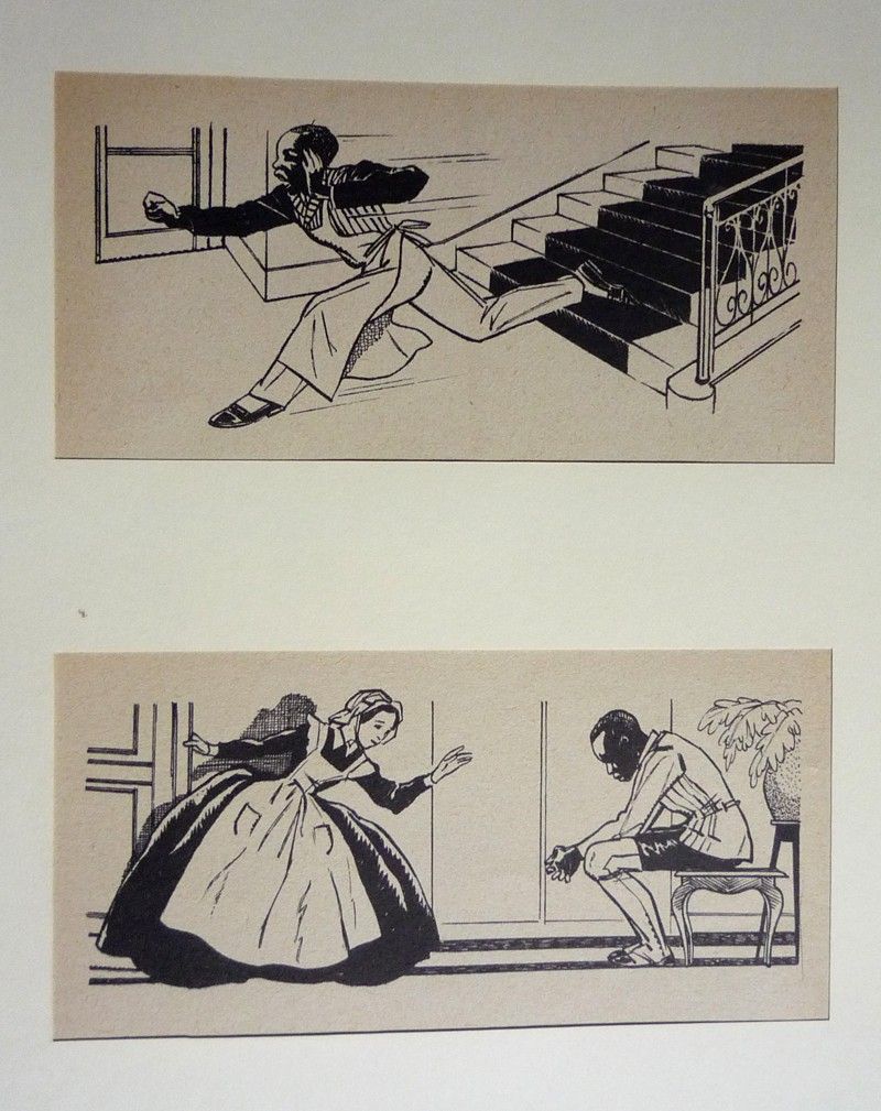 Deux illustrations en noir (environ 10 x 19 cm) par Manon Iessel, représentant des scènes du roman "Après la pluie, le beau temps" de la Comtesse de Ségur (domestique noir se précipitant en bas des escaliers ; servante debout devant le domestique noir assis sur une chaise) ; papier légèrement bruni, par ailleurs bel état.