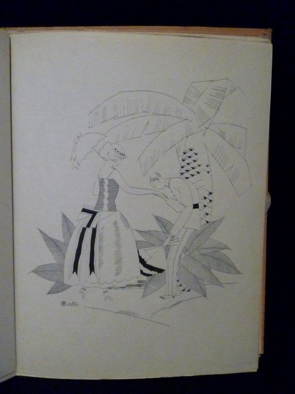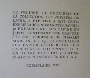 UNE GRAVURE ORIGINALE DE MARTIN. EXEMPLAIRE DE TöTE SUR JAPON. Petit in-4 (20,5 x 27,5 cm.), cahiers sous chemise imprimée rempliée (sous crystal) et sous chemise cartonnée à lacets, portrait gravé de Martin par Dignimont en frontispice, 41 pages avec illustrations noir et blanc in-texte, suivies de 16 planches couleurs et noir et blanc issues de l'oeuvre de Martin, 1 gravure sur bois originale de Martin, un des 50 exemplaires tirés sur Japon (n°38 - avec justificatif de tirage), fac-similé de la lettre-préface de Pierre Mac Orlan, est joint un prospectus de 8 pages des éditions Babou à propos de la collection "Les artistes du Livre", quelques têtes non-découronnées ; chemise cartonnée salie par endroits et usée aux charnières, par ailleurs TRöS BON öTAT.