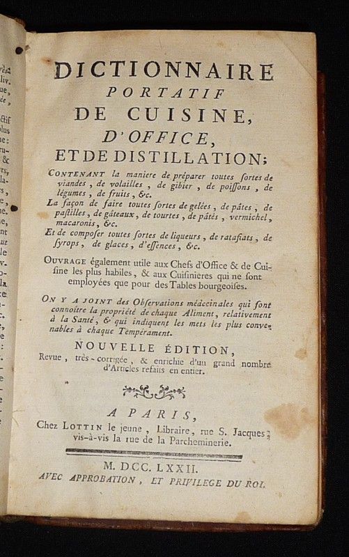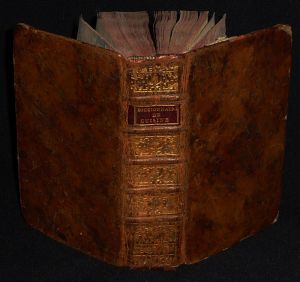 In-12 (11 x 17,5 cm), reliure plein veau, dos à 5 nerfs orné de caisson dorés et d'une pièce de titre, tranches rouges, 372+367 pages, les gardes sont couvertes de notes de cuisine manuscrites ; manques de cuir aux coiffes et coupes, quelques épidermures sur les plats, quelques rousseurs à l'intérieur, par ailleurs assez bon état général.
