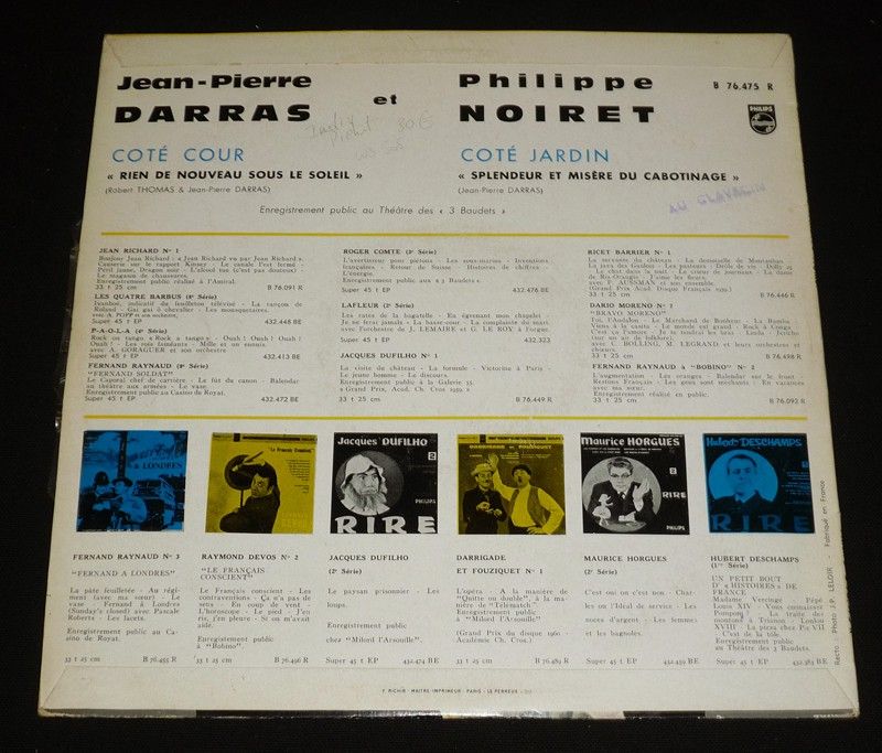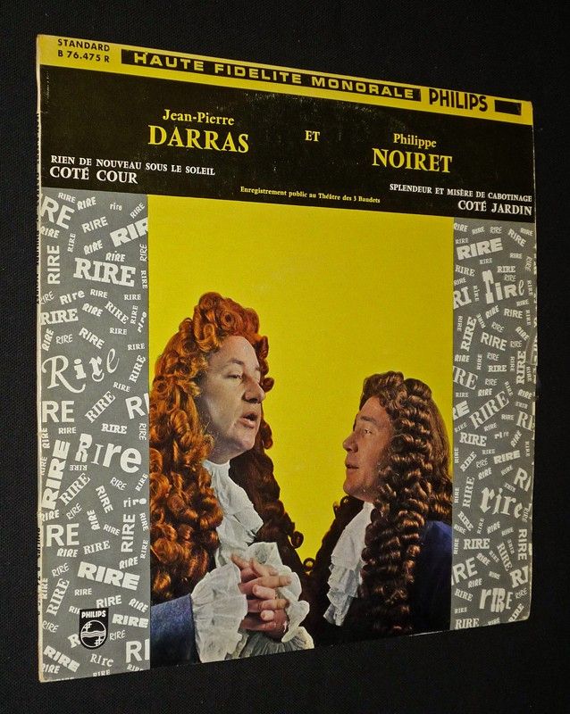 Disque vinyle 33T "Côté cour : Rien de nouveau sous le soleil - Côté jardin : Splendeur et misère du cabotinage" par Jean-Pierre Darras et Philippe Noiret, enregistrement public au Théâtre des 3 Baudets, sans date ; quelques frottements et traces sur la pochette, le disque lui-même présente quelques marques d'usage sans incident majeur, assez bon état.