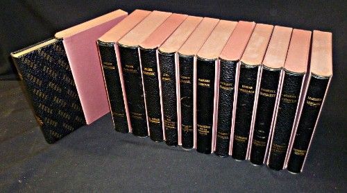 12 volumes in-8 carré, plein cuir moderne noir, sous boites, filet doré, tête dorée, comprenant, Allain, Souvestre : Fantomas ; Conan Doyle : Le chien des Baskerville ; Agatha Christie : le meutre de Roger Ackroyd ; Boileau Narcejac : sueurs froides ; J.H. Chase : Pas d'orchidées pour Miss Blandish ; E. Gaboriau : L'affaire Lerouge ; E. A. Poe : Double assassinat dans la rue Morgue ; P. Cheyney : La môme vert-de-gris, E. Wallace : L'affaire Walton ; G. Leroux : Le mystère de la chambre jaune; D. Hammett : le faucon de Malte ; M. Leblanc : L'aiguille creuse ; tous illustrés de lithographies originales de Buffet, Letellier, Minaux, Guiramand, Cottavoz, Bardone, Carzou, Cueco, Mentor, Brasilier, Garcia-Fons, Genis, un des 3000 exemplaires numérotés sur vélin d'arches, en très bel état.