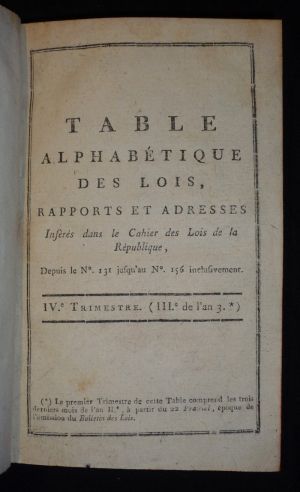 Table alphabétique des lois, rapports et adresses insérés dans le Cahier des Lois de la République, depuis le N°131 jusqu'au N°156 inclusivement. IVe trimestre (IIIe de l'an 3)