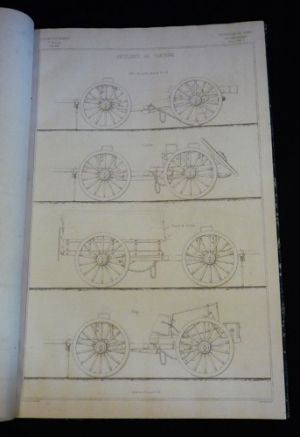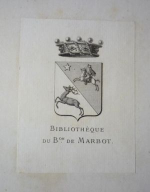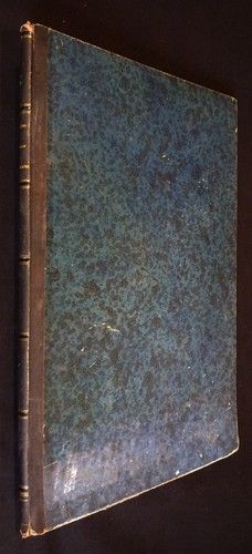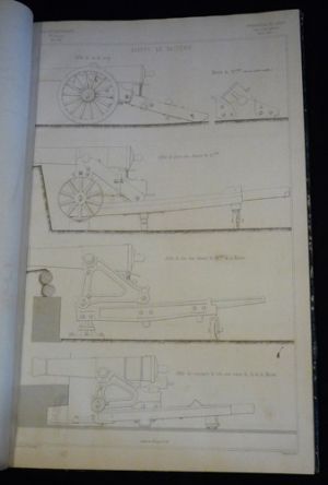In-plano (35 x 54,5 cm), reliure demi-peau, dos lisse, non paginé, ex-libris du Baron de Marbot, célèbre pour ses mémoires romancés relatant ses campagnes sous Napoléon Ier, ouvrage en deux parties : 1ere partie : Arts militaires : série A : 7 feuilles, série B : 5 feuilles, série C : 5 feuilles, série D : 6 feuilles, série E : 6 feuilles, série F : manque la feuille 5 sur 7 ; 2e partie : Cours de topographie, 16 feuilles ; coiffes, bords des plats, et coins usés, traces sur les plats, quatrième plat gondolé, état correct.