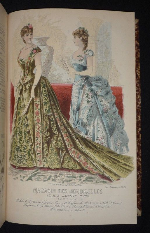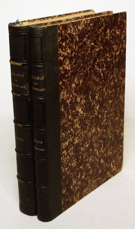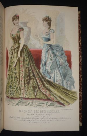 In-4 (26 x 34,2 cm), reliure demi-chagrin, dos lisse, gardes couleur, ce volume contient les années 1886, 1885 et 1887 du "Magasin des Demoiselles" avec 24 et 25 gravures couleurs pour les années...