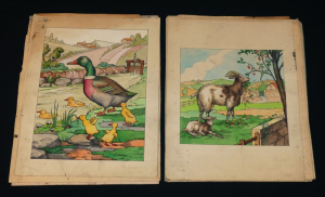25 PLANCHES ORIGINALES. EXEMPLAIRE UNIQUE. ABC des Bêtes en Famille. A. Capendu, 1944. Ensemble complet des 25 planches d'illustrations originales de A. Douet pour l'abécédaire qui portera le titre 'ABC des animaux domestiques', comprenant les deux couvertures (26,2 x 31,7 cm et 25,5 x 32,8 cm, premier plat illustré d'un Ane, d'un Boeuf et d'une Chèvre sur fort carton de réemploi, quatrième plat illustré de trois chats) et 23 planches en couleurs sur papier d'Arches de différentes provenances, un dessin sur deux est plus petit afin de laisser la place en marge inférieure pour le futur texte, annotations de couleurs en marges ; quelques défauts, voir photos, bon état.