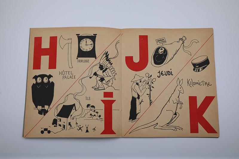 PARTICULIÈREMENT RARE, TRÈS JOLI OUVRAGE. Alphabet de Zizi. Couverture et dessins par André Guillaume. Derna. Paris. 1923. In-8 (24,5x21 cm), (16) pp., broché, couvertures de papier fort à grains illustrées au pochoir en bleu et jaune d'un garçon, chapeau au vent tenant un cerf-volant de lettres, le même s'envolant sur la lettre A dans un cercle, deux fleurs jaunes en pied. Très larges initiales rouges et compositions en noir semblables, parfois, à des ombres chinoises réalisées par André Guillaume. Une à trois lettres par page séparées par une diagonale rouge, légendes des occurrences calligraphiées ; Très bon exemplaire.
