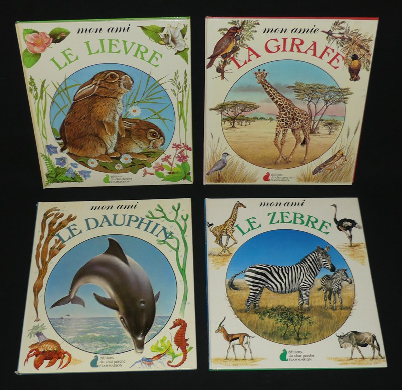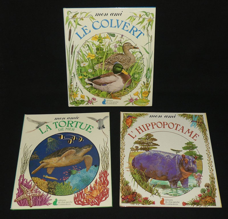 Onze volumes in-8 (21 x 24 cm), albums cartonnés, onze titres de la collection "Mon ami" éditée par les éditions du Chat perché et Flammarion : Mon ami le Castor // Mon ami le Phoque // Mon ami l'Ours // Mon ami le Manchot // Mon ami le Lièvre // Mon amie la Girafe // Mon ami le Dauphin // Mon ami le Zèbre // Mon ami le Colvert // Mon ami l'Hippopotame // Mon amie la Tortue de mer ; coiffes frottées sur l'ensemble des volumes, pelliculage décollé au dos des albums "L"Hippopotame" et "Le Castor", premier plat plus ou moins jauni sur certains volumes, dos de "La Girafe" insolé, ex-libris manuscrit au deuxième plat de trois des albums, par ailleurs bon état d'ensemble, intérieur frais avec de belles illustrations.