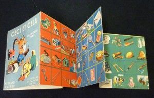 Album dépliant petit in-8° carré, entièrement illustré d'images à découper en couleurs, album de la mère baba n°7 ; mors usés, sans date, inscription manuscrite sur le plat supérieur, bon état.