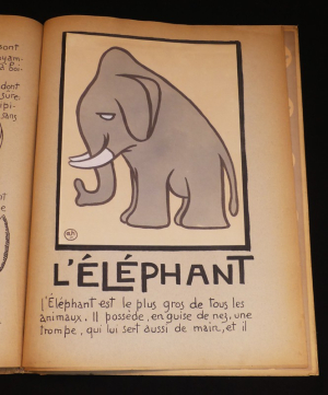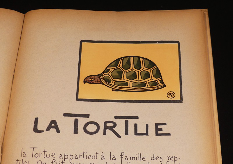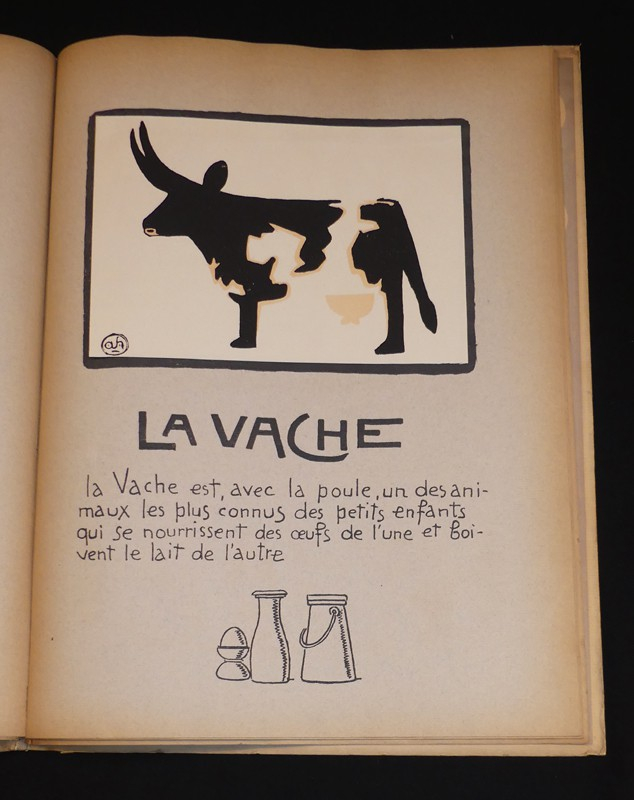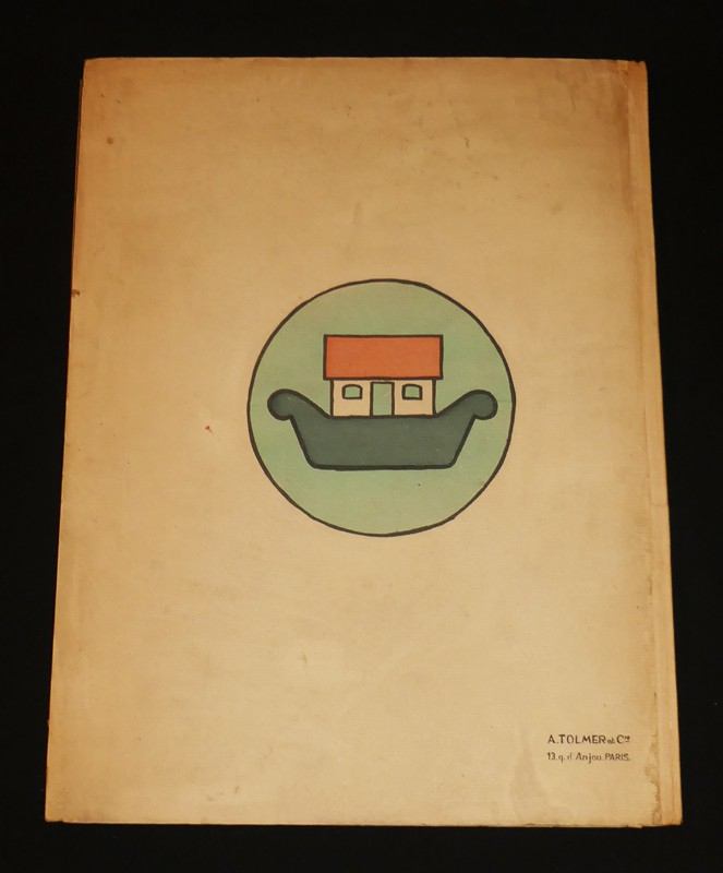 Tolmer, sans date. Album in-folio (32 x 42 cm) en cartonnage souple, plats illustrés, véritable CHEF-D'OEUVRE DE L'EDITION JEUNESSE FRANCAISE, entièrement écrit et dessiné par André Hellé, qui signe ici l'une de ses plus remarquables créations chez Tolmer. Textes calligraphiés, nombreux dessins en noir et 20 superbes planches en lithographies rhaussées au pochoir (dont 19 contrecollées) représentant l'arche de Noé : le tigre, la girafe, le marabout, le lion, l'oiseau des îles, le crocodile, le dindon, le serpent, la tortue, le chameau, l'autruche, la grenouille ; quelques traces sur les plats et frottements sur les bords des plats, par ailleurs bel exemplaire.