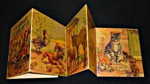 Album dépliant petit in-8° carré, frise, entièrement illustré en couleurs, album de la mère baba n° ; mors légèrement usés, sans date, annotation manuscrite sur la couverture, quelques fines pliures, bon état.