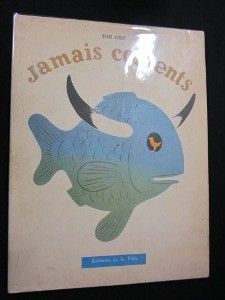 In-4, (31.5x23.5 cm), album cartonné, couverture illustrée d'un poisson en couleurs, non paginé, illustrées de 5 dessins couleurs (plus le dessin de couverture) représentant des animaux, un éléphant révant d'être un oiseau, un oiseau révant d'être un poisson, un poisson, un lézard et un boeuf, ainsi de suite, chacun à cheval sur deux pages, un paragraphe de texte par illustration ainsi qu'une animation : une simple fenêtre à ouvrir présentant l'animal qui va suivre. Artiste et designer italien, Bruno Munari est né à Milan en 1907, et mort dans la même ville en 1998. Quand il ne créait pas des livres pour enfants, Munari peignait, sculptait, composait, dessinait et imaginait des objets pour la production industrielle. Jamais contents ! et L'Histoire des trois oiseaux font partie d'une série pour les enfants imaginée en 1945 ; rousseurs et papier bruni, traces sur les plats jaunis, état très correct.