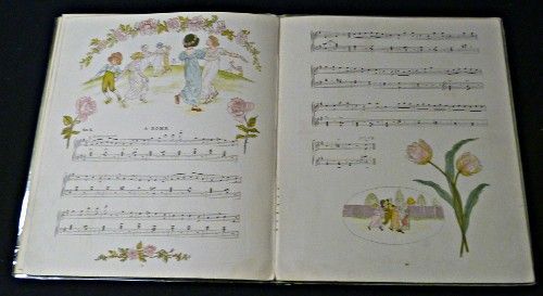 In-8 carré (21 x 25 cm), cartonné, dos de percaline verte, recueil de chansons enfantines, en anglais, proposant sur TOUTES LES PAGES (hormis une seule) au moins un dessin couleurs de KATE GREENAWAY. Bords des plats frottés, brochage lâche. Assez bel état général.
