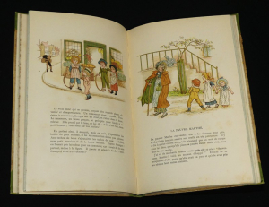 In-8, cartonnage papier de l'éditeur, demie toile verte à coins, plats illustrés, tranches vertes, 64 pp., illustrations couleurs dans le texte et hors-texte et frontispice couleurs de Kate Greenaway, traduction libre de J. Girardin ; cartonnage frotté, rares rousseurs, quelques petites salissures marginales, pages de garde en superbe état, bel exemplaire.