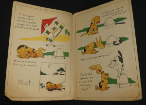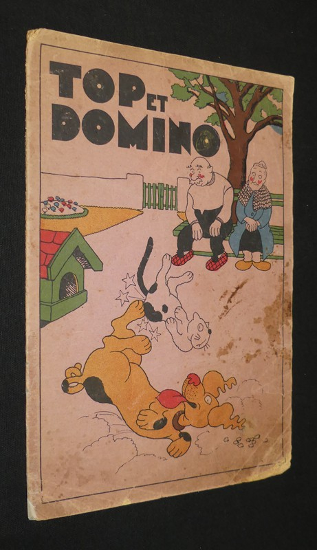 Album souple petit in-4, 27 x 18 cm., couverture illustrée, non paginé, 16 pages illustrées en couleurs, drôle et charmant les aventures d'un chien et d'un chat ; couverture tachée, un manque papier sur le coin inférieur de la quasi totalité de l'album, état correct.