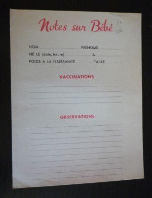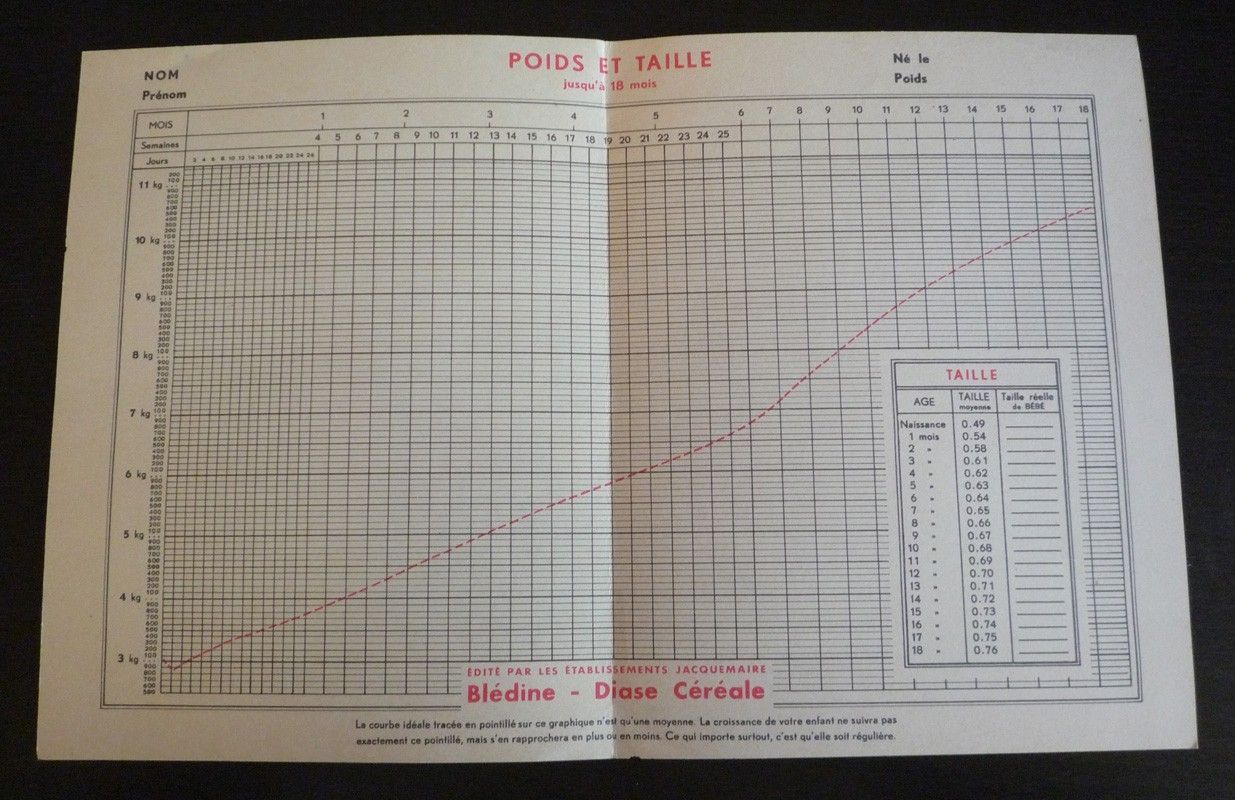 In-12 (13,4 x 17,4 cm), plaquette, 4 pages, courbe de croissance bébés éditée par les Etablissements Jacquemaire (Blédine, Diase Céréale) ; très bon état général.