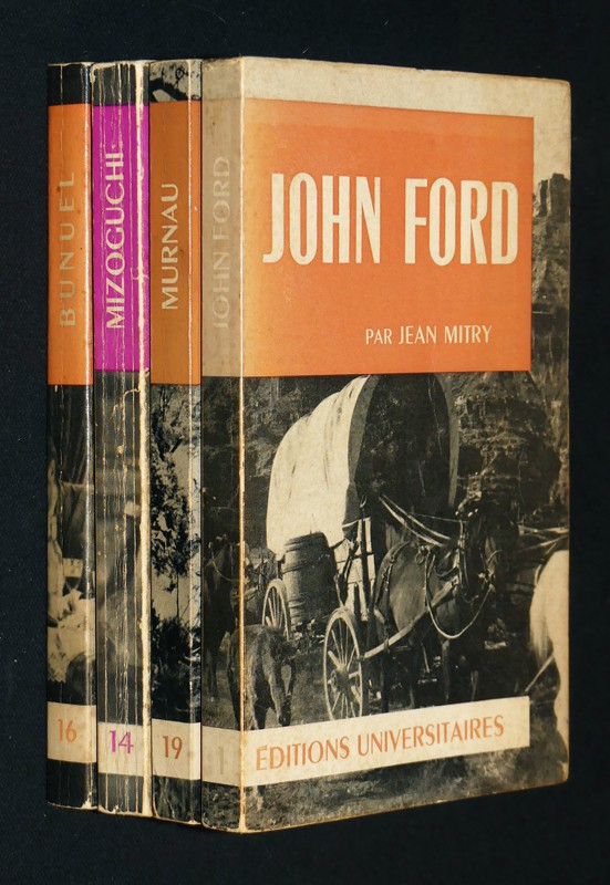 Quatre volumes in-12 brochés (17 x 11 cm.), couvertures illustrées de photographies tirées des films, ce lot comprend les titres suivants : John Ford - Murnau - Mizoguchi - Bubuel, illustrés de photographies en noir et blanc, 190 pages par volumes, publiés dans les années 60 ; mors blanchis, tranches salies, fines pliures sur les dos, lot en bon état.