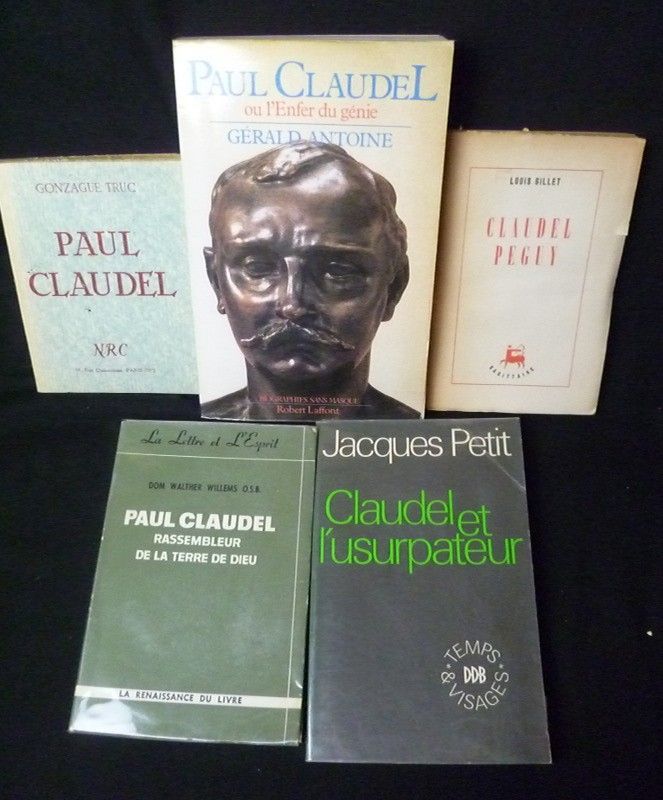Lot de 5 volumes in-8, dos carrés collés et brochés, "Claudel Péguy" (244 pages - 1946), "Claudel et l'usurpateur" (211 pages - 1971), "Paul Claudel" (174 pages - 1945), "Paul Claudel rassembleur de la terre de Dieu" (251 pages - 1964), "Paul Claudel ou l'enfer du génie" (475 pages - 1988) ; dos un peu plissés, assez bon état d'ensemble.