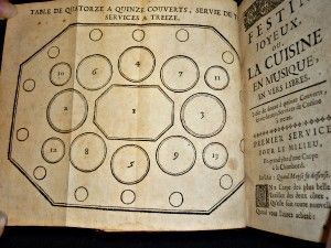 Deux parties en un volume in-12 relié (9 * 15,5 cm) plein veau, Première partie : Titre, des pages III à X pour l''Epître dédicatoire aux Dames de la Cour' et la préface, 1 feuillet non chiffré pour d'approbation, puis les tables et le privilèges courant de la page 17 à 27, 1 planche repliée hors texte : 'Table de quatorze à quinze couverts, servie de trois services à treize' puis xcijj pages Exemplaire de la bibliothèque de Jules Couët bibliothécaire archiviste de la Comédie-Française, avec son ex-libris « Du cabinet d'un vieux bibliophile » deuxième partie : 189 pages, 1 feuillet blanc, 24 pages de musique, 16 pages de table. Notice 360 de la bibliographie gastronomique de Vicaire. 'Ce premier recueil de recettes en chansons est dédié aux dames de la cour. L'auteur se dit officier de cuisine, applaudi pour son savoir-faire lors des festins de 1722, à l'occasion du sacre de Louis XV à Reims. Ses quelque cent quarante-cinq recettes témoignent de son expérience par leur exactitude et leur sobriété. Sur des airs en vogue, elles sont destinées à une table de douze à quinze couverts, servie en trois services de treize plats, ainsi qu'à un ambigu, recueil plus informel, où voisinent viandes et desserts. L'esprit du livre consiste à faire chanter la recette du cochon à la galantine sur l'air de Marie-Anne était coquette et celle de la noix de veau en fricandeaux glacés sur l'air de Beautez, plus friandes qu'un chat'. in « Livres en bouche » BNF, Hermann 2001. Catalogue commenté de l'exposition éponyme. Petites épidermures aux coins et sur les plats,quelques rousseurs, bon exemplaire.