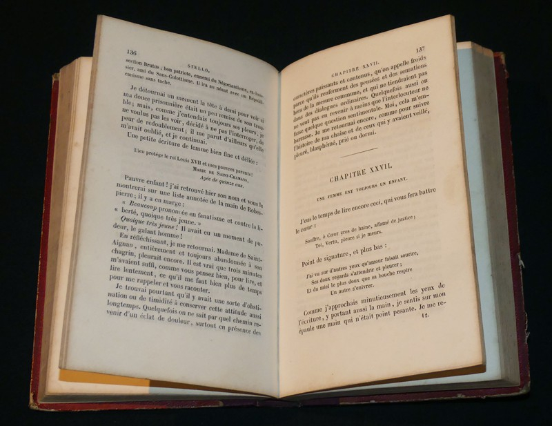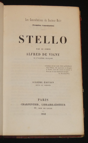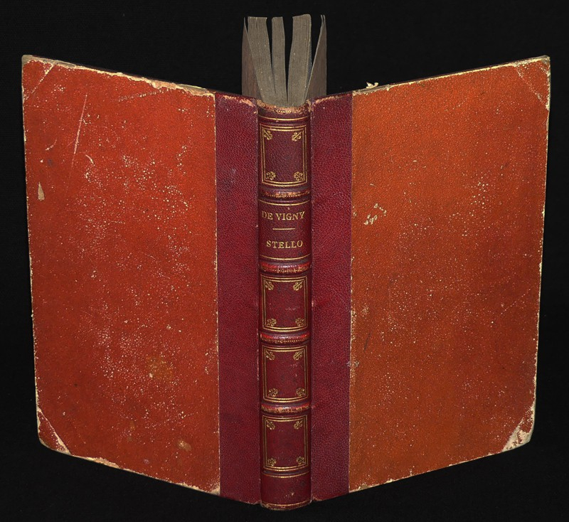 In-12 (11x18.5 cm), relié demi-chagrin rouge, plats chagrinés, titre et auteur dorés au dos à quatre nerfs, caissons dorés, tête grise, 316 pages, envoi d'Alfred de Vigny 'donné à Esther, moi l'auteur', 6e édition revue et corrigée ; coiffes à peine frottées, coins et bords assez frottés, traces de frottement sur les plats, quelques rousseurs à l'intérieur, assez bon état.