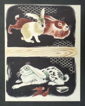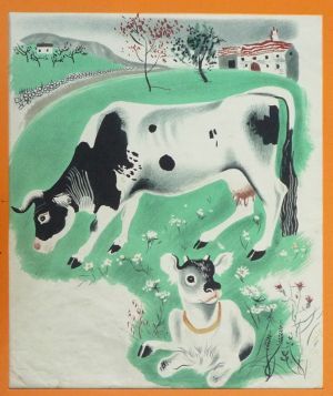 Illustration en couleurs (18,5 x 24 cm sur support 23,7 x 27,8 cm) de Hélène Guertik, tirée de l'album "La Ferme du Père Castor" ; papier légèrement froissé, bon état....