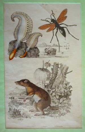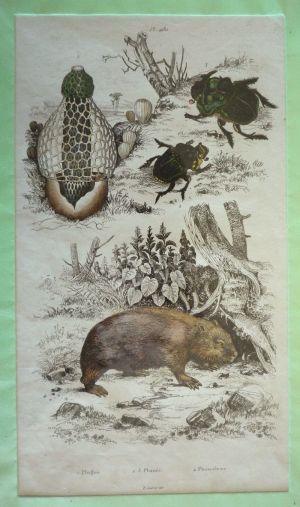 Gravure en couleurs (env. 13 x 21 cm sur support 18,5 x 27 cm), planche n°480, (Phallus, Phanée, Phascolome), extraite du "Dictionnaire pittoresque d'histoire naturelle et des phénomènes de la...