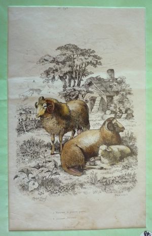 Gravure en couleurs (env. 12 x 20 cm sur support 18,5 x 27 cm), planche n°393, (Mouton à grosse queue, Mouton Mérinos), extraite du "Dictionnaire pittoresque d'histoire naturelle et des phénomènes de la nature", dirigé par Guérin-Menneville ; trace en queue, par ailleurs bon état.