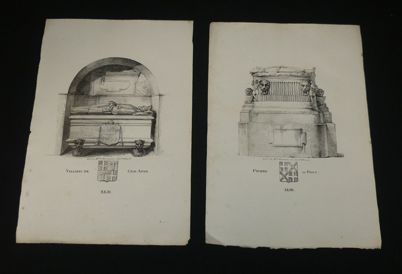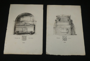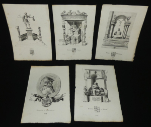 In-8 (17 x 25 cm), 65 gravures en noir tirées de l'ouvrage "Monumens des grands-maîtres de l'Ordre de St Jean de Jérusalem" par Villeneuve-Bargemont (Paris, 1829, J. J. Blaise éditeur), lithographies de Villain et Mlle Formentin ; rousseurs et quelques salissures plus ou moins importantes selon la planche, assez bon état général.