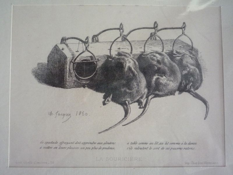 Gravure en noir (13 x 10 cm sur support 31 x 22 cm) signée Charles Jacques, intitulée "La Souricière", tirée des "Chefs-d'oeuvre" imprimés par Chardon-Wittmann ; très bon état....