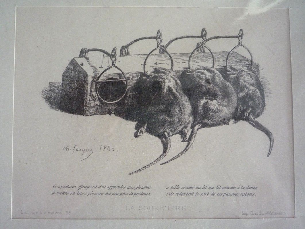 Gravure en noir (13 x 10 cm sur support 31 x 22 cm) signée Charles Jacques, intitulée "La Souricière", tirée des "Chefs-d'oeuvre" imprimés par Chardon-Wittmann ; très bon état.
