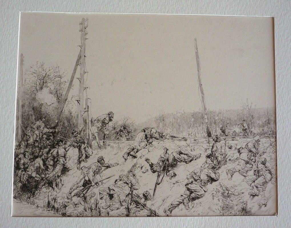 Gravure XIXe en noir (19,5 x 15,5 cm sur support 22,5 x 31 cm) d'E. Le Rat, d'après A. de Neuville, intitulée "Combat sur une voie ferrée" ; quelques très légères rousseurs dans la marge, par ailleurs très bel état.