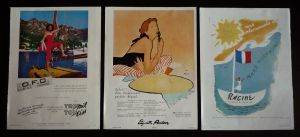 Lot de 3 publicités (23,8 x 31,6 cm) estivales pour Elizabeth Arden, Racine et O.F.D., tirées de la revue Plaisir de France ; très bon état général....