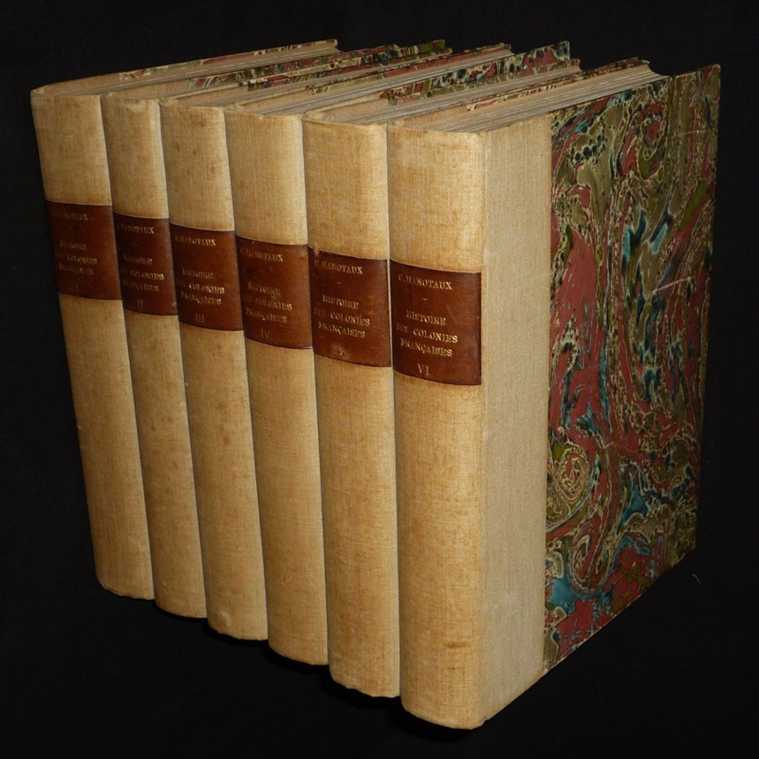 Six volumes in-4 (24 x 28,7 cm), reliure demi-toile, dos lisse, pièce de titre, imprimés en 1929-1934, illustrations en noir dans le texte et hors textes en couleurs ; Tome 1 : Introduction générale - L'Amérique (630 pages) // Tome 2 : L'Algérie (547 pages) // Tome 3 : Le Maroc - La Tunisie - La Syrie - L'Oeuvre scientifique française en Syrie et en Perse (604 pages) // Tome 4 : Afrique occidentale française - Afrique équatoriale française - La côte des Somalis (611 pages) // Tome 5 : L'Inde du XVIe siècle à 1720, et de 1720 à nos jours - L'Indochine (598 pages) // Tome 6 : Madagascar - Les Comores - Les Iles de France et de Bourbon - Le Pacifique français - Les Français dans l'Afrique du Sud - Conclusion générale (583 pages) ; dos brunis, rousseurs sur la toile et à l'intérieur des volumes, par ailleurs assez bon état général.