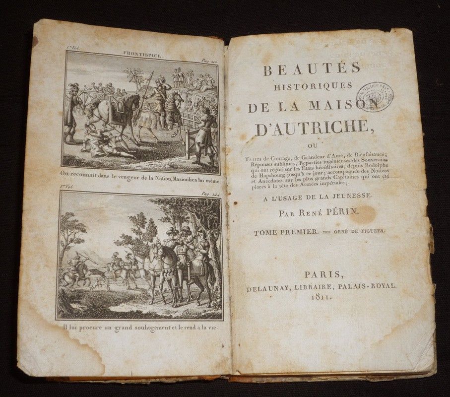 In-12 (10,5 x 17,2 cm), reliure demi-peau, dos lisse, xx-360 pages, tome 1 seul des "Beautés historiques de la maison d'Autriche, ou Traits de courage, de grandeur d'âme, de bienfaisance ; Réponses sublimes, réparties ingénieuses des Souverains qui ont régné sur les Etats héréditaires, depuis Rodolphe de Hapsbourg jusqu'à ce jour ; accompagnés des notices et anecdotes sur les plus grands capitaines qui ont été placés à la tête des armées impériales ; à l'usage de la jeunesse", ouvrage orné de figures en noir hors texte ; mors supérieur légèrement fendu aux coiffes, coins et coupes usés, assez bon état.