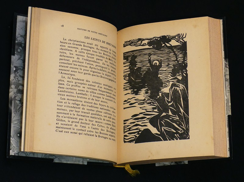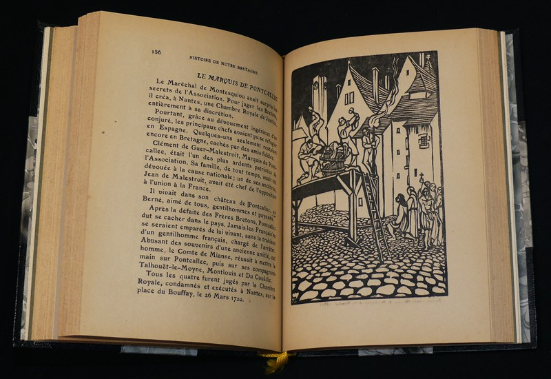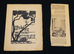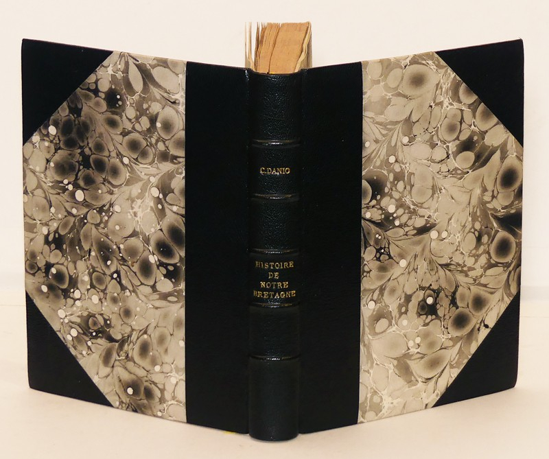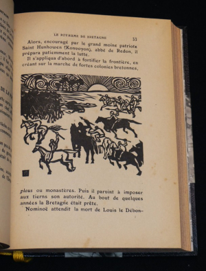 Ouvrage très recherché pour les illustrations de Jeanne Malivel. Peu commun. Exemplaire relié demi- chagrin bleu nuit à coins, in-12 (14,5 x 19,5 cm), broché, 238 pages, ici l'un des 1000 exemplaires non numérotés (tirage total à 1050 exemplaire dont 50 sont numérotés), ouvrage décoré de gravures sur bois originales et d'une carte nouvelle de la Bretagne armoricaine par Jeanne Malivel, couverture et dos conservés. Complet du petit errata volant imprimé en rouge, ainsi que de la plaquette de présentation et du bulletin de souscription (c'est deux documents sont assez rare). Un des anciens propriétaires de ce livre a joint un article de journal concernant l'attentat perpétré à Rennes contre un monument élevé à la Bretagne. Attentat perpétré le 7 août 1932 ; reliure moderne, quelques taches sur les plats, très bel état général.