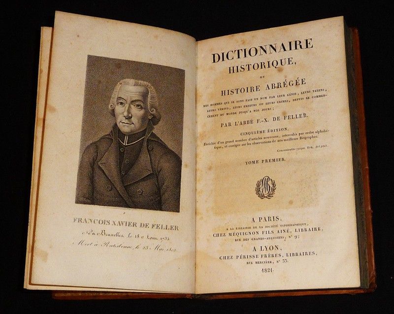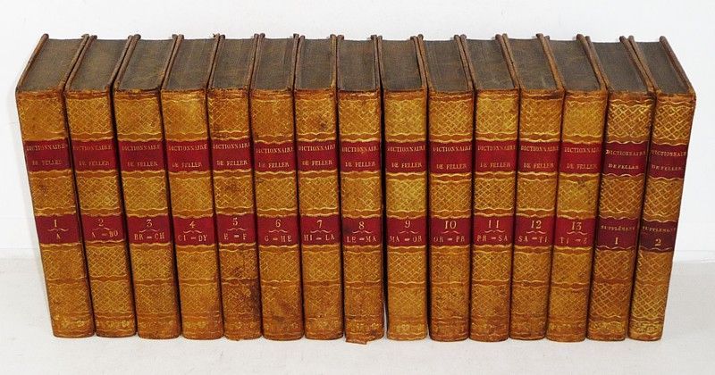 Quinze volumes in-8 (13,5 x 20,8 cm), reliure plein veau, dos lisses ornés de dorures et de pièces de titre et de tomaison, liseré d'encadrement sur les plats, tranches marbrées, le Dictionnaire en 13 volumes (VIII-464, 558, 604, 572, 478, 509, 482, 540, 522, 540, 539, 516 et 557 pages) est accompagnés d'un supplément en 2 volumes (536 et 455 pages), frontispice au 1er tome ; frottements et petits incidents aux mors, coiffes et coins selon le volume, des rousseurs à l'intérieur, ex-libris manuscrit au stylo argenté au 2e plat du tome 1, par ailleurs assez bel état général.