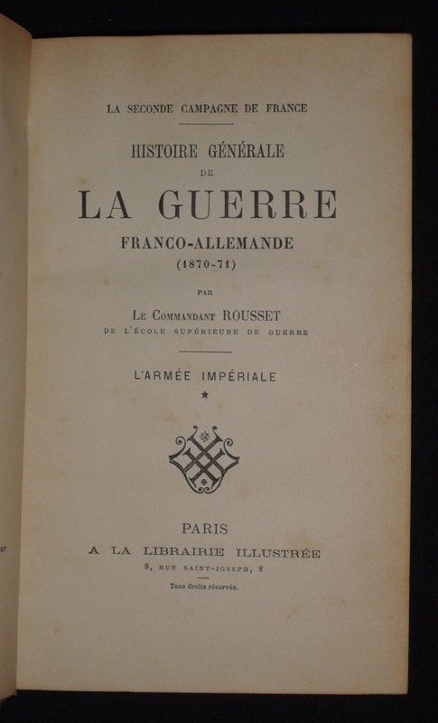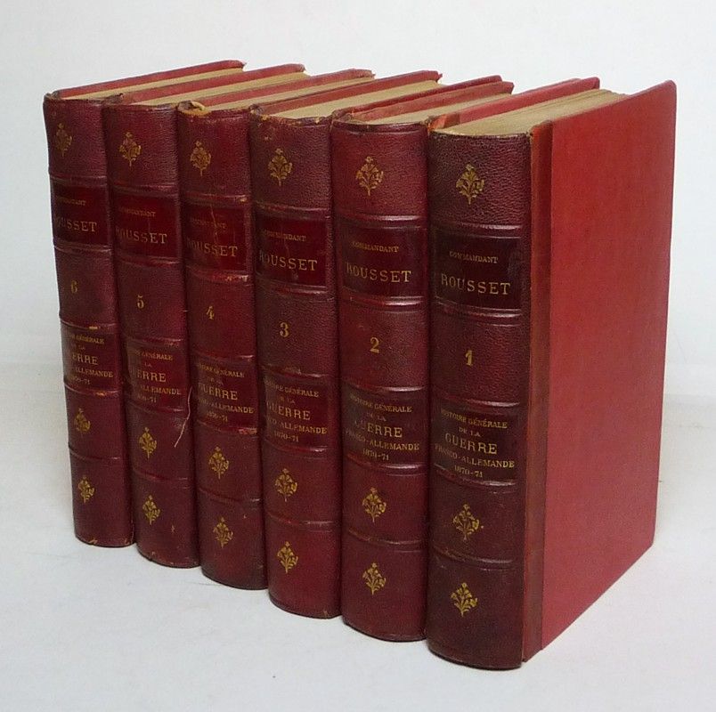 Six volumes in-8 (15 x 22,2 cm), reliure demi-chagrin, dos à 5 nerfs ornés de fleurs dorées, plats de percaline, gardes couleur, sans date, cartes en fin de chaque volume ; Tome 1 : L'Armée impériale, Vol.1 (VIII-425 pp.) ; Tome 2 : L'Armée impériale, Vol. 2 (528 pp.) ; Tome 3 : Le Siège de Paris (439 pp.) ; Tome 4 : Les Armées de province, Vol.1 (432 pp.) ; Tome 5 : Les Armées de province, Vol.2 (362 pp.) ; Tome 6 : Les Armées de province, Vol.3 (372 pp.) ; dos du tome 1 restauré, marques d'usure sur les coiffes et coupes, quelques décolorations sur les plats, bord de la toile décollé au premier plat du tome 2, par ailleurs assez bon état.