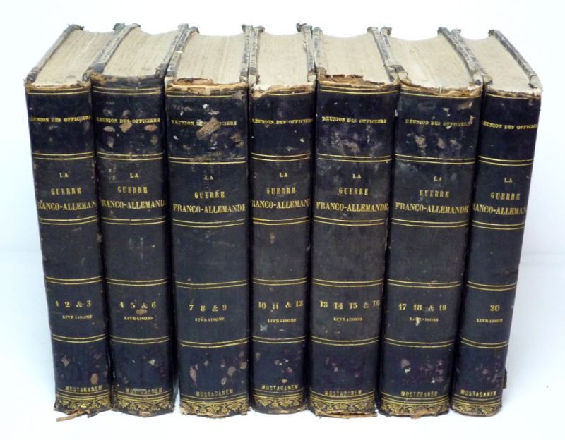 Peu commun. In-8 (15,5 x 23,3 cm), reliure demi peau, 20 livraisons en 7 volumes, texte complet en 1466 pages + les suppléments pour 1003 pages, cartes in et hors texte, manquent les atlas, ouvrage rédigé par la section historique du Grand Etat-Major Prussien ; coiffes abîmées, quelques épidermures sur le cuir et marques d'usage sur les plats, coins et coupes frottés, état moyen.