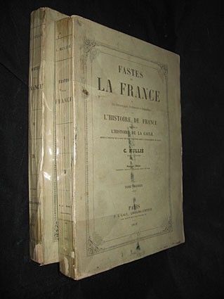 2 volumes in-4 (19x27 cm), broché, 384 et 307 pages, 7e édition, faits chronologiques, synchroniques et géographiques de l'histoire de France précédés de l'histoire de la Gaule depuis l'arrivée de la race celtique en Europe jusqu'à l'établissement des Franks ; traces sur les plats, pliures et petits manques sur les dos, rousseurs, état très correct.