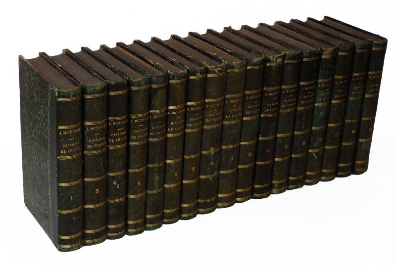 Dix-sept volumes in-12 (12 x 18 cm), reliure demi-basane, dos lisses ornés de filets dorés, 17 volumes sur les 19 que comptent cette "Histoire de France" de Jules Michelet (manquent les tomes 7 et 9) ; Tome 1 : Les Celtes - Les Gaulois - Les Francs - Le monde germanique - Les Mérovingiens - Les Carlovingiens (415 pp.) // Tome 2 : Dissolution de l'Empire Carlovingien - La France féodale - Les Capétiens - Les Normands - Les Croisades - Les Communes (416 pp.) // Tome 3 : Les Albigeois - Philippe-Auguste - Saint Louis - Les Vêpres Siciliennes - Philippe le Bel et Boniface VIII (326 pp.) // Tome 4 : Les Templiers - Les Valois - Etienne Marcel - La Jacquerie (322 pp.) // Tome 5 : Charles V et Du Guesclin - Charles VI et sa folie - Le Duc d'Orléans et le Duc de Bourgogne - Les Cabochiens (330 pp.) // Tome 6 : La Maison de Bourgogne - Les Guerres avec l'Angleterre - Jeanne d'Arc (335 pp.) // Tome 8 : Louis XI et Charles le Téméraire (348 pp.) // Tome 10 : La Réforme (423 pp.) // Tome 11 : Les Guerres de religion (397 pp.) // Tome 12 : La Ligue et Henri IV (384 pp.) // Tome 13 : Henri IV et Richelieu (378 pp.) ; Tome 14 : Richelieu et la Fronde (368 pp.) // Tome 15 : Louis XIV et la Révocation de l'Edit de Nantes (407 pp.) // Tome 16 : Louis XIV et le Duc de Bourgogne (378 pp.) // Tome 17 : La Régence (388 pp.) // Tome 18 : Louis XV (1724-1757) // Tome 19 : Louis XV et Louis XVI (414 pp.) ; quelques épidermures sur le cuir et coupes frottées sur l'ensemble des volumes, quelques marques d'usure aux plats selon le volume, assez bon état général.