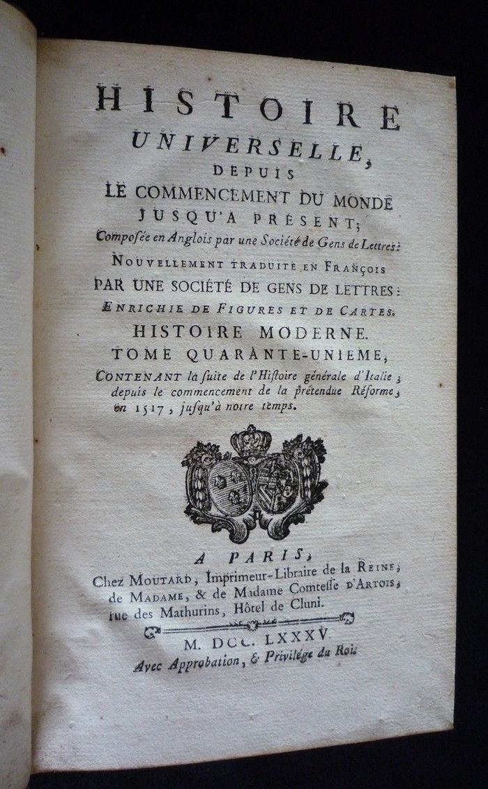 In-8 (20,5 x 13,5 cm), demi-basane, paginé vj-xxxj et 2-527, tranches rouges ; tome quarante-unième contenant la suite de l'Histoire générale d'Italie, depuis le commencement de la prétendue Réforme, en 1517, jusqu'à notre temps ; petites déchirures sur les plats, mors supérieur frotté, quelques rousseurs à l'intérieur, bon état général.